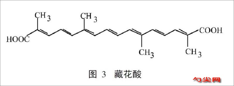 梔子黃色素主要成分是類胡蘿卜素類的 藏花素( Croc in)和藏花酸(C rocet in) ,還含有環烯醚萜苷類的梔子苷以及黃酮、綠原酸。藏花素和藏花酸是少有的水溶性類胡蘿卜素,分子中存在多個共軛雙鍵,它們一方面賦予梔子色素黃色,另一方面也是梔子色素不穩定的原因之一。梔子黃色素中有七種藏花酸的衍生物,這七種衍生物的彩度( chroma)和明度(brightness) 差別很少,但是隨著與藏花酸連接的葡萄糖基因數目的增加,衍生物色調色( hue)減少,色澤由紅色向黃色轉為。