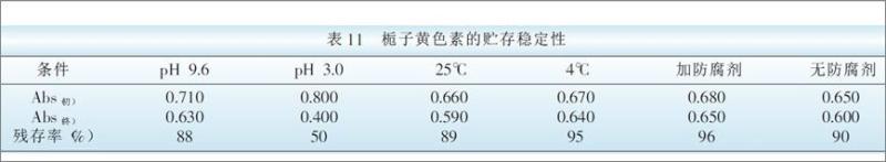 梔子黃色素液在pH 1~ 7時為橙黃色,pH 8~12時為亮黃色。在酸性條件下色素穩定性較差,中性、堿性條件下色素穩定性良好。與其他類胡蘿卜色素相似,梔子黃色素耐日光性較差。除Fe 、Cu 以外,常見金屬離子對梔子黃基本無影響。