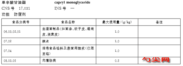 單辛酸甘油酯為食品添加劑是以辛酸、甘油為原料進行酯化反應(yīng)后經(jīng)精制制得的,分子式為C11H22O4,相對分子質(zhì)量為218.29(按2011年國際相對原子質(zhì)量),中華人民共和國衛(wèi)生部就食品添加劑過氧化鈣于2016年8月31日發(fā)布了食品安全國家標(biāo)準(zhǔn),現(xiàn)行標(biāo)準(zhǔn)號為 GB 1886.57-2016 ,自2017年1月1日起開始實施。