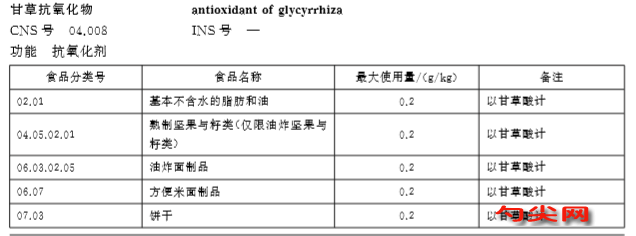甘草抗氧化物亦稱甘草抗氧靈,又稱絕氧靈。其主要抗氧化成分為黃酮和類黃酮類物質的混合物。它是從提取甘草浸膏或甘草酸之后的甘草渣中提取的一組脂溶性混合物,為棕色或棕褐色粉末,略有甘草的特殊氣味。不溶于水,可溶于乙酸乙酯,在乙醇中的溶解度為11.7%。
