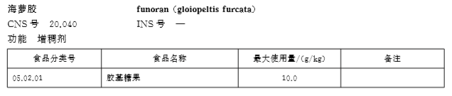 GB 2760—2007規定為增稠劑。可用于膠基糖果,最高用量以10.0g/kg為限。海蘿膠與磷酸氫鈣、木糖醇、制備的木糖醇口香糖有很好的保護牙齒琺瑯質的功能。