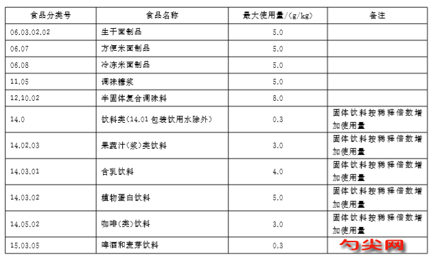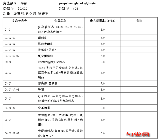 我國《食品添加劑使用衛生標準》(GB2760-2011)規定:海藻酸丙二醇酯的最大使用量,乳脂香精為2g/kg;冰淇淋為lg/kg;啤酒、飲料為0.3g/kg;乳制品、果汁、乳粉為3g/kg;膠姆糖、巧克力、煉乳、氫化植物油、沙司、豆奶飲料為5g/kg。FAO/WHO(1994)規定:青刀豆、黃刀豆、甜玉米、蘑菇、蘆筍、青豌豆等罐頭為10g/kg(單用或合用總量,以下相同);干酪為8g/kg;乳脂干酪為5g/kg;冷飲為l0g/kg;番茄醬為2~5g/kg;大豆飲料為1~2g/kg;酸黃瓜為5g/kg 。