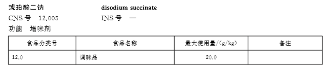 1.琥珀酸二鈉與谷氨酸鈉配合使用,一般使用量為谷氨酸鈉的10%左右。我國《食品添加劑使用衛生標準》(GB2760-1996)規定,琥珀酸二鈉可用于調味料,最大用量為20 g/kg。