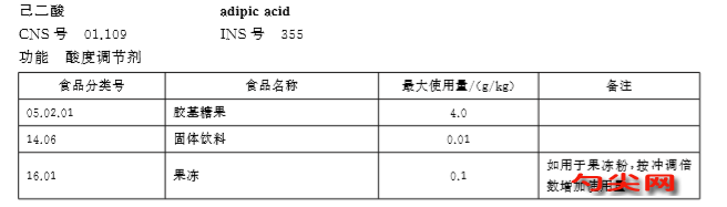己二酸酸味柔和且持久,在較大的濃度范圍內pH值變化較小,是較好的pH值調節劑。GB2760-2007規定,本品固體飲料,其最大使用量是0.01g/kg;也可用于果凍和果凍粉,用于果凍的最大使用量為0.01g/kg;用于果凍粉時,可按沖調倍數增加使用量。