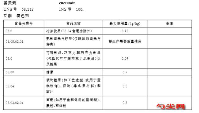 姜黃素是聯合國糧農組織食品法典委員會批準的食品添加劑(FAO/WHO-1995),是我國《食品添加劑使用衛生標準》中最早頒布的,允許在食品中使用的九種天然色素之一。新頒布的《食品添加劑使用標準》(GB2760-2011)規定,冷凍飲品,可可制品、巧克力和巧克力制品以及糖果,膠基糖果,裝飾糖果、頂飾和甜汁,面糊、裹粉和煎炸粉,方便米面制品,調味糖漿,復合調味料,碳酸飲料和果凍中姜黃素的最大使用量分別為0.15、0.01、0.7、0.5、0.3、0.5、0.5、0.1、0.01、0.01 g/kg,人造黃油及其類似制品、熟制堅果與籽類、糧食制品餡料和膨化食品中可按生產需要適量使用。
