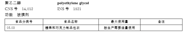 美國聯邦食品藥物和化妝品法規的食品添加劑增補條例中,已批準把食物化學品藥典級的聚乙二醇直接或間接地用作食品添加劑。FAO/WHO1985年規定ADI值為0~10mg/kg體重。GRAS(FDA,§172.820,1985)。急性經口毒性(小鼠)LD5033~35g/kg,腹膜內毒性LD5010~13g/kg。不刺激眼睛,不會引起皮膚的刺激和過敏。