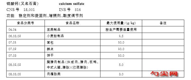 2.食用級可用作營養增補劑(鈣質強化)、凝固劑、酵母食料、面團調節劑、螯合劑,還用作番茄、土豆罐頭中的組織強化劑、釀造用水的硬化劑、酒的風味增強劑等。