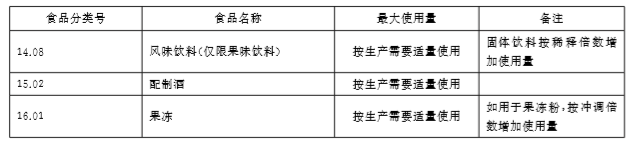 ①我國(guó)《食品添加劑使用衛(wèi)生標(biāo)準(zhǔn)》(GB2760-2011)規(guī)定:可按生產(chǎn)需要適量用于果味型飲料、糖果、配制酒、果醬、調(diào)味類(lèi)罐頭、蜜餞、糕點(diǎn)上彩裝、糕點(diǎn)、冰棍、雪糕、果凍。