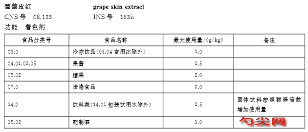 葡萄皮紅為花色苷類色素,其主要著色的成分為錦葵素,芍藥素、翠雀素和3´-甲花翠素或花青素的葡萄糖苷。