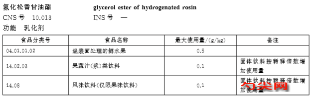 可用于果汁(味)型飲料,最大用量0.1g/kg;用于膠姆糖基礎劑,最大用量為100g/kg;用于乳化香精,最大用量為100g/kg。具體參見松香甘油酯。