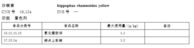 沙棘果實(shí)中富含大量黃色素,主要成份為黃酮類物質(zhì)和U-胡蘿卜素等。沙棘黃天然色素著色力強(qiáng),色澤鮮艷,不僅安全可靠,而且可以改善食品風(fēng)味,應(yīng)用范圍較廣,是一種理想的天然色素。