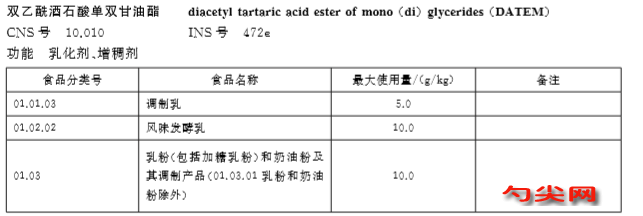 雙乙酰酒石酸單(雙)甘油酯簡稱為DATEM。它具有較強的乳化、分散、防老化等作用,是良好的乳化劑和分散劑。能有效增強面團的彈性,韌性和持氣性,減少面團弱化度。增大面包、饅頭體積、改善組織結構。除此還可用于糖和糖漿及香辛料。