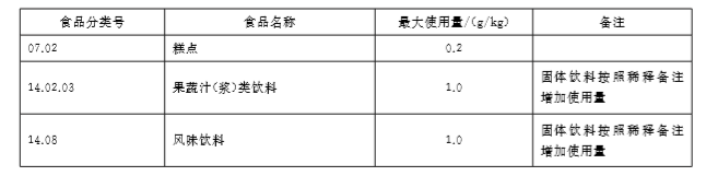 可作為天然著色劑。中國(GB2760—1996)規(guī)定:可用于果汁(味)型飲料、醬油、醬菜、糖果、糕點、罐頭等。可作為焦糖色的代用品。用于果汁(味)型飲料、醬油、醬菜,最大用量為0.1g/kg;用于糖果、糕點,最大使用量為0.2g/kg;用于罐頭,最大使用量為0.3g/kg.不溶于體積分數(shù)大于40%的乙醇溶液及油脂。可作為焦糖色的代用品。