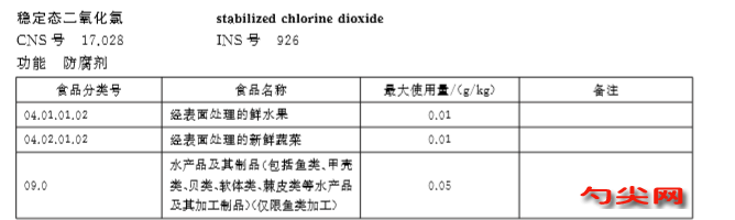 在GB2760-1996《食品添加劑使用衛生標準》中穩定態二氧化氯作為食品添加劑出現在果、蔬保鮮及魚類加工的防腐劑目錄中,在GB2760-2011《食品添加劑使用衛生標準》中,食品分類號“04.01.01.02經表面處理的鮮水果”及“04.02.01.02經表面處理的新鮮蔬菜”中作為防腐劑,最大使用量為0.01g/kg;食品分類號為“09.0水產品及其制品(包括魚類、甲殼類、貝類、軟體類、棘皮類等水產品及其加工制品)”中是唯一指定的防腐劑,最大使用量為0.05g/kg;該標準同時將二氧化氯列為食品工業加工助劑。由此可見,穩定態二氧化氯應用于食品工業越來越得到世界范圍的認可.具有廣闊的發展前景。
