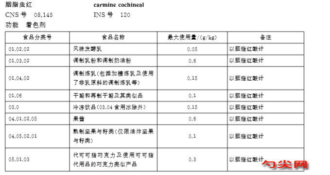 根據(jù)中華人民共和國國家標準:食品添加劑使用標準(GB 2760-2011)中的規(guī)定,按照國家標準在中國,胭脂蟲紅在食品中的適用范圍和最大使用量如下表所示:
