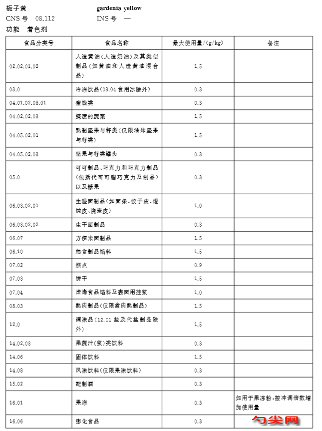 小鼠經口LD50為22000mg/kg體重。蓄積性、致突變試驗:有弱蓄積性,無致突變作用。用添加2%梔子黃色素的飼料進行亞慢性毒性試驗,結果無任何異常,故本色素安全性。按照GB2760-2011《食品添加劑使用衛生標準》規定:梔子黃可用于果汁(味)型飲料、配制酒、糕點上彩妝、冰棍、雪糕、膨化食品、果凍、面餅、糖果和栗子罐頭等,最大使用量為0.3/kg。實際使用時,用于一般汽水、汽酒為0.2/kg;竹葉青酒為0.19/kg;用梔子黃按1:7加水制得梔子黃色素液,對蛋卷著色,在和面時按25:1加入,染色效果較好;用于月餅餅皮的調色,梔子黃的最大使用量為0.3/kg;用于糖果,其使用量為0.05%~0.2%;用于糕點,其使用量為0.01%~0.1%。梔子黃用于飲料效果好,色澤艷麗,雖高溫煮沸亦不變化,使用量為0.02%~0.1%,但不宜使用于酸性飲料,以防褪色。本品可用于保健品的制備 [1] 。