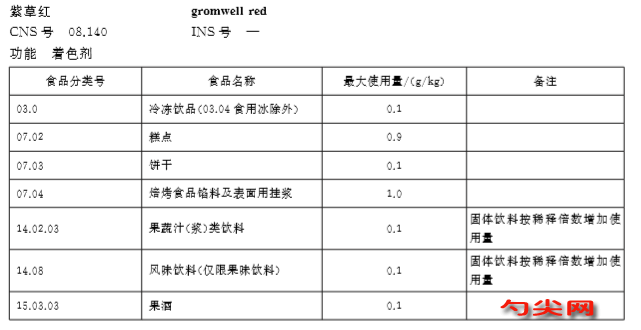 我國《食品添加劑使用衛生標準》中規定:可用于果汁(味)飲料類、雪糕、冰棍、果酒,最大使用量0.1 g/kg;紫草紅色素為油溶性色素,耐熱性好,耐鹽性、著色力中等,耐金屬鹽較差。適用于中性、酸性食品。