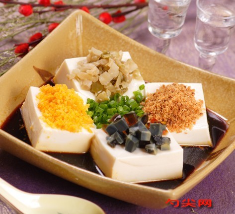 豆腐切成方塊或菱形塊,裹上干淀粉,放進180度的熱油中炸至表皮酥脆,就可以制成各式脆皮豆腐菜式。把炸好的豆腐按長方形或方陣形、葵花形、山形等排在碟上,然后澆上芡或帶副料的芡,芡要稠些,便可烹制出各種味道的脆皮豆腐。