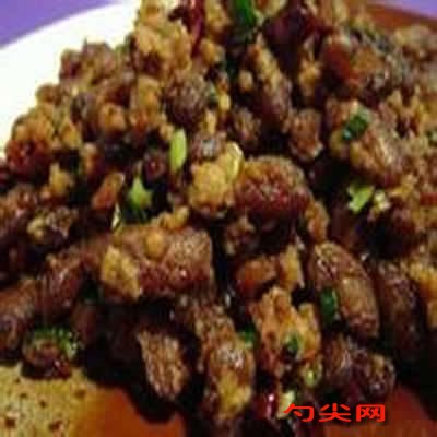 3.另起鍋炸干辣椒、肉末、青蒜,再下炸好的豆,下調(diào)料,起鍋淋上香油。