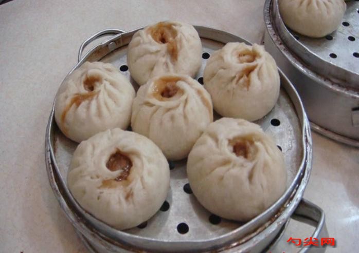 4.成型熟制:把餳好的面團揉勻,搓成直徑為2厘米的圓條,扯成100個劑子,再分別用手掌按成直徑為4厘米的圓皮,包上餡心,捏成細花紋,中間不封口。放入蒸鍋內,用旺火沸水蒸約8分鐘即成。