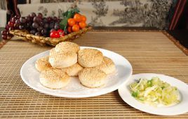 3.將餅坯放入燒至七成熱的吊爐餅鐺上,蓋上燒熱的爐蓋,烤約8-10分鐘,至餅皮金黃酥脆,里面柔軟熟透,即可食用。