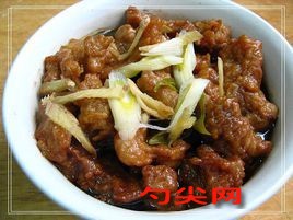 2.鍋內加花生油1000克,燒至七成熱,將調好的肉下鍋,炸至柿黃色撈出,放在扣碗內,放入大茴香、花椒、蔥姜絲和高湯250克,上屜蒸40分鐘,去掉大茴香、花椒、蔥姜,扣在海碗內