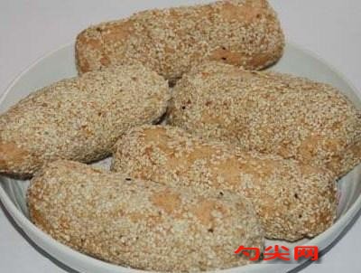 成品呈圓柱形,金黃色,外粘白糖,外觀飽滿,膨脹適度,內(nèi)部組織為絲網(wǎng)狀,無空洞,無硬心。吃著酥香可口,入口即化,營養(yǎng)豐富,是老少皆宜的美味糕點。