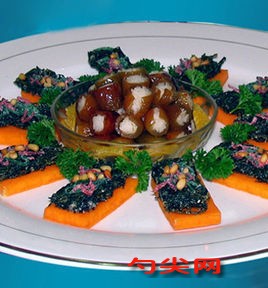 3.將荸薺挖個小洞裝滿翡翠心,上籠蒸一下,取出棗子飯倒扣在大盤中間,將熟荸薺碼在棗子飯周圍,每個翡翠上面按上1只櫻桃,荸薺四周再碼1圈桔子。