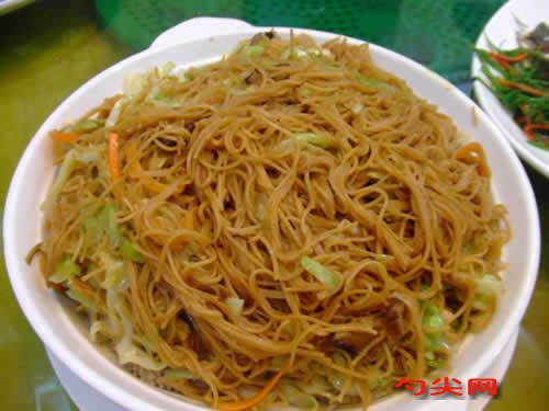 炒面線,是福建廈門獨具特色的地方傳統名點,系原"全福樓"、"雙全酒家"所創。至今已有五六十年歷史了。選用上等面線(有些地方也叫線面)放在七成熱的油鍋里炸至赤黃色,撈上盤后用開水燙去油膩待用;以瘦肉、冬筍、香菇、蒜苗為配料,切成絲炒過,和以扁魚、蝦瀝,酌加紹興酒,然后再把炒過的面線拌配料再炒。吃時以沙茶醬、紅辣醬為佐料。