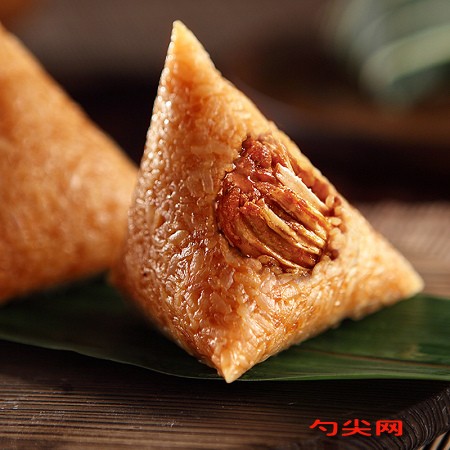 2、包棕。將選好的棕葉,放入沸水鍋內煮3~5分鐘,撈起用清水洗凈,理直瀝干。包粽子時拿兩張棕葉,毛面朝外,交叉折轉成漏斗狀,左手拿住棕葉,右手抓放糯米,放3小塊肉,上面再抓放些糯米,將肉塊蓋沒,最后將長出的部分棕葉折轉蓋住米,包成四角立體狀,呈矮壯長方形,用水草捆扎6圈,再將草繩頭尾并在一起,轉三轉塞入草圈內。包時注意四角平衡,水草繞緊,不軋死,不能打結;