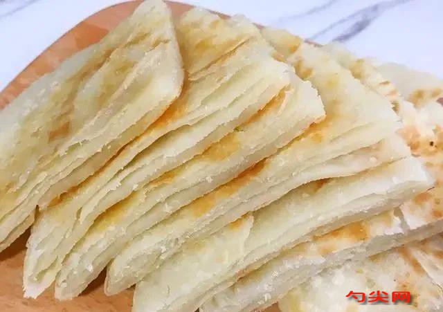 工藝:1.盆里加入300克面粉,3克鹽、面欣酥A3克,倒入燒熱的開水,邊倒開水別攪拌,攪拌成大面絮。2.攪拌好的大面絮里加入30克食用油3.揉成面團(tuán),放盆里醒十分鐘。4.碗里加入20克白面。5.把25克油燒熱,倒入面粉里做成油酥。6.醒好的面放案板上揉光滑,蓋上保鮮膜醒十分鐘7.把醒好的面團(tuán)搓條。下成三個(gè)大小一樣的劑子8.把劑子搟成薄片,上面抹上油酥9.用刮板把面胚分成8份10.從一頭開始,一片一片折疊11.最后把面團(tuán)封好口,把面團(tuán)翻個(gè)面,把面團(tuán)稍加整理就可以了12.把面胚搟成圓形大薄餅13.鍋里倒油,油燒熱后,把餅放進(jìn)來,小火煎制兩面金黃,所有的餅都做完14.把做好的餅切塊裝到盤子上。