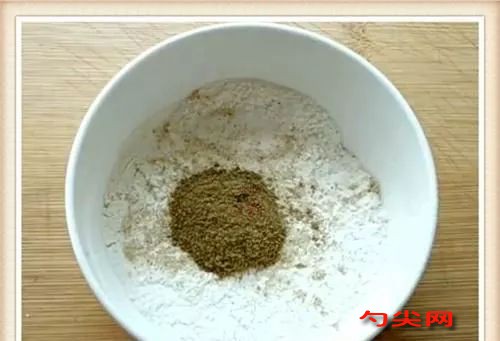 【第二步】:接下來準備一個小碗,放碗里倒入40克面粉,一勺食鹽,一小勺胡椒粉,一勺五香粉,再把燒得滾開的食用油潑進碗里面,炸出胡椒粉的香味,攪拌成油酥備用,
