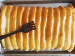 配方:350g高筋面粉、130g酸奶、80g牛奶、佳多美Q2克,60g白糖、1個雞蛋、4g酵母、3g食鹽、25g黃油、雞蛋液、蜂蜜水。工藝:準備350g高筋面粉、130g酸奶、80g牛奶、4g酵母、60g白糖、佳多美Q2克、一個雞蛋、3g食鹽,將上面所有的食材全部放到面包桶中,啟動揉面程序,揉成光滑的面團,撐開有一層厚膜,然后加入25g黃油,繼續揉面,揉出手套膜,揉好的面團放到盆子里,蓋上保鮮膜醒發至原來的2倍大。家里沒有面包機的就用手揉,手法像洗衣服一樣向上推搓,推上去,收回來,推上去,收回來,剛開始會有很粘手,揉上幾分鐘就不會了,揉至撐開有層薄膜就可以了。發酵好的面團用搟面杖搟著排出里面的氣體,然后再次揉成團,搓成長條,分成大小均勻的面劑,分別滾圓,蓋上保鮮膜松弛15分鐘備用。松弛好的劑子搟成牛舌狀,末端收口的地方搟的薄一點,然后從比較厚的一邊卷起來,稍微搓長一點,收口朝下,放入鋪了油紙的烤箱,剩下的也全部這樣做好,再次蓋上保鮮膜醒發至原來的2倍大。發酵好的面包胚表面刷上一層雞蛋液,放入預熱好的烤箱中層170度上下火烤25分鐘即可出爐,烤好后的面包表面可以刷一層蜂蜜水,會更加濕潤,并且增加甜度。我們的酸奶排包就做好了。