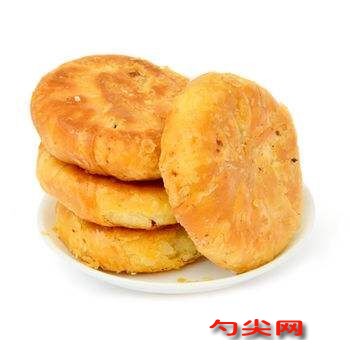 工藝:制皮糕點粉和面欣酥E干拌均勻置于臺板上開塘,加入其他皮料,攪拌成皮面團。制餡芝麻炒熟磨成屑,核桃仁粉碎,豬肉糖漬后切丁,蔥剁成碎末,然后加入糖、油、腐乳、水、鹽等,拌和均勻,最后加人熟糕點粉,揉透擦勻即可。成型將皮面搟成2mm厚的薄片,取一塊心料均勻鋪上,卷成長卷狀,然后用刀切成薄段。產品有兩種規格:大玉環酥每個重40g左右,小玉環酥6g左右。烘烤生坯上盤,入爐烘烤,控制溫度250℃,時間12min,烘烤至表面呈棕黃色即可。切面呈螺旋環形,平整黃潤,層次清晰,皮層松脆,餡心酥松,鮮辣甜咸,風味別致。