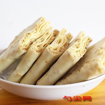 工藝:取5斤面粉加9斤開水燙糊(注:可以不燙糊),降溫至40℃加入10克酵母發(fā)酵1-3小時(shí)。將剩余面粉、黃豆粉干拌均勻,加入面糊,再加入8斤水調(diào)糊,要打攪成有彈性的面糊,靜止30分鐘。將面欣酥提前兩個(gè)小時(shí)用少許涼水浸泡溶解,然后攪拌均勻,再加入面糊中攪勻,即為煎餅糊。將鏖子燒熱,擦點(diǎn)油,倒上面糊,用竹蜻蜓刮平,文火烙熟。將烙好的煎餅趁熱撒上烤熟的花生碎或芝麻仁、花生醬、辣椒粉、食用鹽等,然后疊卷成長(zhǎng)方形,再次放烤箱烤至至酥脆,即為花生或果仁煎餅。