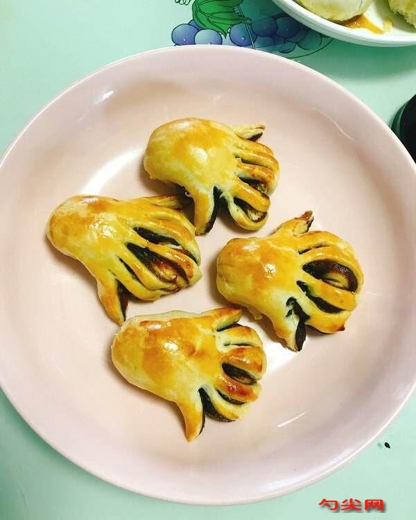 工藝:制皮面欣酥C置于臺板上開塘,加豬油、飴糖和水攪和均勻后,倒塘與面欣酥C拌勻。制酥面欣酥C和豬油擦成油酥即可。制餡大紅棗洗凈去核,入鍋加水煮15min,絞碎成棗泥;取另一鍋內加麻油、白糖加熱使糖溶化,倒入棗泥,用小火慢慢翻炒至濃,出鍋加入糖桂花即可。成型將皮面和油酥面各分成12g左右的小劑,然后皮包酥,搟成酥皮。包人棗泥餡15g,封口搟成橢圓形,用手將一頭按,扁成鏟刀狀,在按扁的一頭用刀順著方向切成8條“手指”,將中間的幾條先折在后面粘住,再將兩邊的各兩條翻進粘疊起來,最外面的短指留住,在中腰部分用兩手指捏瘦即為生坯。烘烤生坯入爐,爐溫180~200℃,烘烤10~15min即熟取出。
