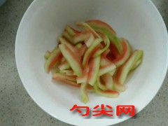配方:西瓜皮1000克、舒欣脆G8克、食鹽50克、白糖80克、白醋30毫升、生抽20毫升、蒜末30克、辣椒粉10克、味達蕾901號0.8克、香菜適量。