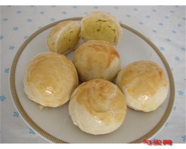 工藝:制皮豬油和水放人盆中攪勻,投入糕點(diǎn)粉,面欣酥E,美久亭Q充分揉拌制成皮面。制酥糕點(diǎn)粉與豬油混合,拌搓均勻即可。包酥按大包酥形式進(jìn)行包酥,包酥后用小開酥方法搟制成酥皮。拌餡熟豬油切成小丁,與白糖拌勻;糖冬瓜、核桃仁剁碎,加入糖豬油中拌和均勻后捏成圓團(tuán),然后再用豆沙將圓團(tuán)包裹起來,即制成餡心。成型按皮:餡=6:5的比例包餡,搓成圓形即成生坯。烘烤生坯上盤,人爐烘烤。爐溫150℃,烘烤5~6min。待酥面起酥后即可出爐冷卻,包裝即成。飽滿的圓形,底部平整,餡心端正;表面雪白,酥潤細(xì)膩,剖面心料清晰。豬油晶瑩透明,豆沙油潤香甜。