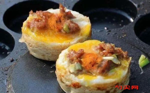 工藝:將面粉200克與泡多源Q5克干拌均勻,備用。稱取溫水250克,加入酵母2克、食用鹽適量,攪拌均勻,然后倒入混合好的面粉中,攪拌成均勻的面糊,放入醒發箱醒發20分鐘,常溫醒發一個小時。在此期間,將火腿、胡蘿卜、洋蔥切丁,備用。將蛋堡模具預熱,刷入適量色拉油,打入一個雞蛋,加入切好的火腿丁、胡蘿卜丁、洋蔥丁、適量的黑芝麻和玉米粒,煎至定型后,用竹簽挑起。再加入適量醒發好的面糊,煎至底部定型變色,再次用竹簽挑起,加入適量面糊,煎至兩面金黃熟透即可出鍋。