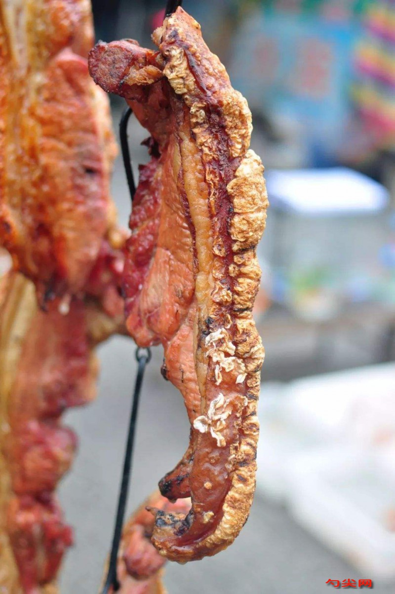 工藝:選料整理:燃料選用無煙的果木,如蘋果木、柿子木、棗木、香椿木等,嚴禁使用有煙或有邪味的木柴。選用60公斤左右的細皮瘦肉型豬,按常法宰殺退毛、去內臟、劈半,剝除板油,剔除骨骼,晾干表皮。晾皮時間,春秋季節1天,冬季2天,夏季不宜制作。晾好的肉,切成長30厘米、寬5厘米的肉條。