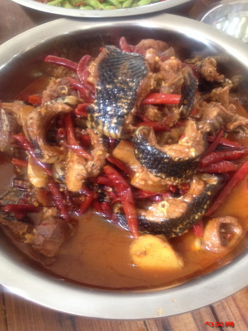 工藝:1、將蛇宰殺,與皮一起斬成3厘米長的段,五花肉切成2厘米的片。2、下油將五花肉炒香,然后把五花肉挑出,加入生姜、花蛇,下入鹽、味達蕾901#、豆瓣醬、辣妹子辣醬、花生辣醬,入高壓鍋壓4分鐘。3、鍋內放入色拉油燒至五成熱,放入尖紅椒和壓好的花蛇,旺火炒3鐘,淋香油即可。花生辣醬配方:干辣椒25克,熟花生150克,花椒40粒,色拉油50克,鹽15克。