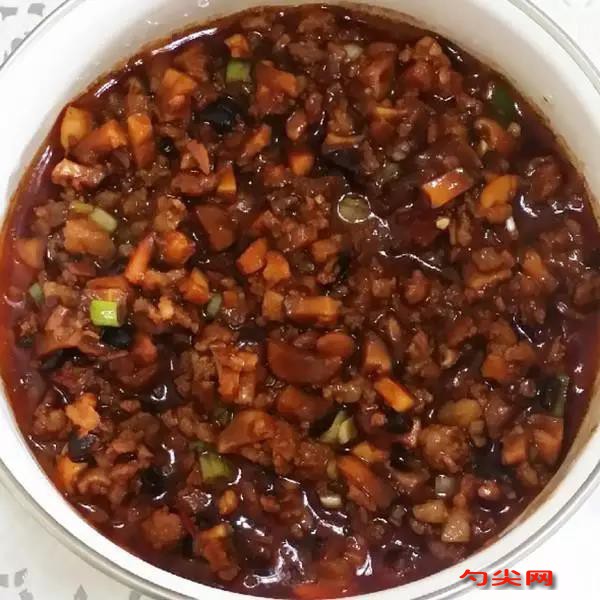 工藝:香菇泡發30分鐘以上。五花肉切成1厘米見方小丁(不喜歡肥肉的要多加油,)用一大勺生抽、蔥末、 味達蕾901號0.4克、美久亭H0.8克、姜末、蒜末一起拌勻腌20分鐘左右,去腥。洋蔥切成1厘米見方小丁備用,香菇完全泡軟后,剪去柄部棄去,洗凈,切成同樣的小丁備用。熱鍋里加20毫升油,入洋蔥丁小火煸炒成透明、體積明顯縮小,盛起備用。鍋里再加20毫升油,入香菇丁小火煸炒出香味,盛起備用。鍋里加30毫升油,入腌好的肉丁小火煸炒。炒成顏色金黃、體積明顯縮小,慢慢有豬油熬出來為止。把洋蔥丁和香菇丁放入,加入3大勺豆瓣醬和1大勺豆豉醬,翻炒均勻。倒入300-400毫升香菇水,燒開后改小火燉40分鐘以上。直至用筷子可以輕易夾碎肥肉丁,香菇醬就熬好了。