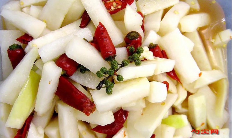 配方:白蘿卜1斤。調(diào)料:鹽30克、糖10克、白醋15克、貴州剁辣椒醬50克、野山椒150克,舒欣脆G4克,美久亭C1克