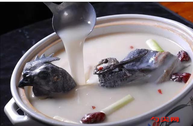 濃湯 :老母雞2只(約3千克),棒子骨3千克,龍骨2千克,乳鴿2只。將以上各料洗干凈,焯水后備用,取一個不銹鋼桶,加入清水25千克,上火燒開,下入各料小火熬制8小時即可。