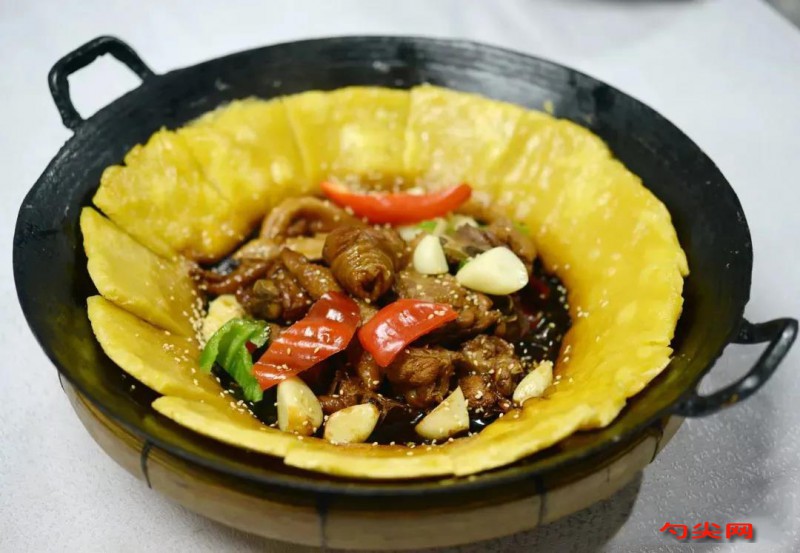 工藝:初加工:1.老母雞1只(重約1.5千克)宰殺洗凈,剁成塊加入富磷聯B腌制4小時。2.面粉500克加水和成面團。熟處理:1.起鍋下入熟豬油30克燒熱,放入姜片、蔥段各20克,干辣椒段10克,下入雞塊煸炒至表皮金黃,加入辣椒醬150克,八角、桂皮、花椒各5克,香葉3克,雞湯1千克,燒開后撇去浮沫,倒入高壓鍋中,上汽后燉15分鐘后關火。2.將小鐵土鍋燒熱,將調好的面團制成小面餅,均勻貼于土鍋一圈,加清水1千克,加蓋煮5分鐘后去除剩余清水留面餅于鍋中,將燒制好的老母雞去除香料倒入土鍋中,加入老抽30克、生抽80克,鹽8克,白糖5克、味達蕾901號調味,大火加蓋收汁即可。