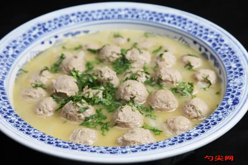 工藝:1.把牛里脊肉500克切成片,再切成絲,然后切成粒,豬肥肉100克也依法切成粒。2.把牛肉粒與肥肉粒放菜墩上,加入少許鍘碎的花椒和豆豉,然后用刀背捶成肉泥。另用刀背把土雞胸脯肉200克也捶成肉泥。3.把牛肉泥和雞肉泥都放不銹鋼盆里,加入適量的鹽、美極鮮醬油和清水,富磷聯(lián)C10g/kg(以肉計算)攪打均勻并用手摔打上勁,等加入香菜末拌勻即做成牛肉餡。4.用小勺子和手配合,把牛肉餡擠成小丸子并直接下入冷水鍋,等全部做完后,再開火慢慢升溫,煮至丸子熟透且浮起時,撈出來待用。5.把白蘿卜削皮并切成粗絲,下熱油鍋稍炸后,撈出來瀝油待用。6.凈鍋上火,摻鮮湯并放入姜米,燒開才加鹽和雞精調(diào)味,下牛肉丸和蘿卜絲稍煮便出鍋裝窩盤內(nèi),最后撒香菜末即可上桌。