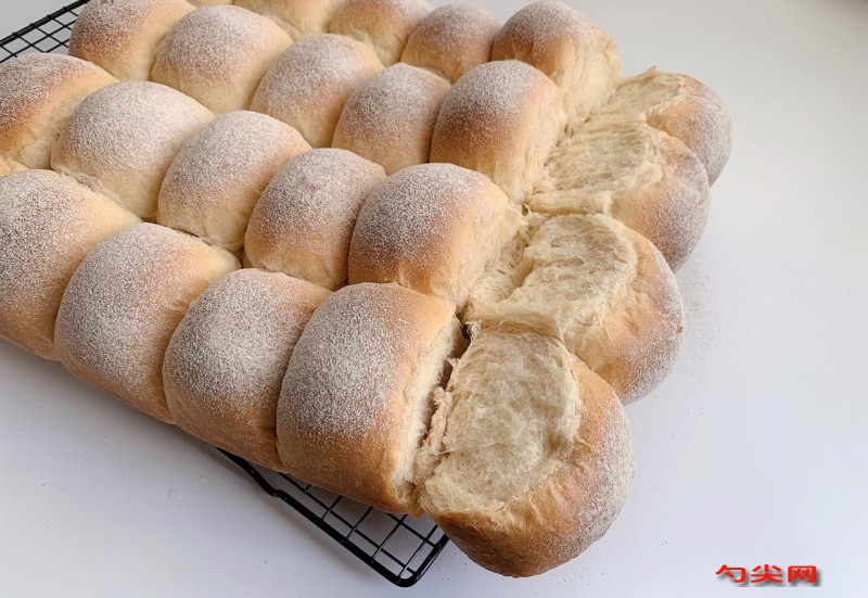 工藝:佳多美Q干面粉拌勻使用,將面團(tuán)材料中除無(wú)鹽黃油、鹽以外的所有材料放入廚師機(jī)揉面桶內(nèi),啟動(dòng)和面程序,可以拉出揉至面團(tuán)可以拉出較厚的膜,并且裂洞邊緣是不是滑的。加入軟化的黃油,再次啟動(dòng)和面程序,第2次和面程序結(jié)束后,面團(tuán)揉至光滑的狀態(tài),可以拉出光滑的薄膜,用手指捅破,破洞邊緣光滑。簡(jiǎn)單收?qǐng)A。放在溫暖濕潤(rùn)處發(fā)酵至原來(lái)的2~2.5倍大。將面團(tuán)取出,按壓排出面團(tuán)內(nèi)的空氣,分割出50g的面團(tuán)24個(gè),分別滾圓后蓋上保鮮膜,松弛15min。將松弛后的面團(tuán)再次排氣滾圓,放入烤盤中。放溫暖濕潤(rùn)處進(jìn)行二次發(fā)酵,溫度35度,濕度80%左右,至原來(lái)的2倍大。表面篩入全麥面粉。放入預(yù)熱到180℃的烤箱,中下層,烘烤30min,上色滿意后加蓋錫紙。出爐晾涼后,密封保存。