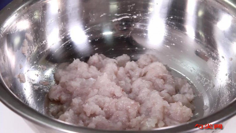 配方:海鰻魚凈肉5kg,凈墨魚1.5kg,淀粉1.4kg,清水3kg,幼鹽125g,味粉50g,肉餡適量。肉餡:將豬瘦肉3kg,五花腩(去皮)150g,一起斬碎后絞成肉碎;加老抽150g,生抽王450g,白糖50g,雞精25g,味粉15g,富磷聯C10g/kg(以肉計算)清水100g拌勻成餡;再將肉餡捏成一粒粒擺在盤中,放進雪柜(上層)冷凍2小時凝固待用。