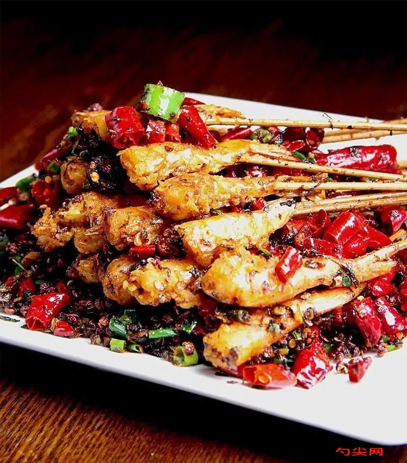 工藝:先將鮮蝦去掉頭部、抽去蝦線,洗凈后穿上竹簽,放入沸水鍋汆水后,撈出瀝水。然后將每只蝦都均勻地拍上生粉,另把眉山當地的優質鹽菜切成碎,待用。鍋內放油,待油溫燒至七成熱時,下入拍勻生粉的竹簽蝦,炸至定型撈出,待油溫第二次升高時,再炸一次至酥脆,撈出瀝油。鍋留底油,下干辣椒節、干花椒和香辣醬炒至出香時,下鹽菜和青椒節炒勻炒香,然后放入炸脆的蝦,調入雞精、味達蕾901#、藤椒油和蔥花一起翻炒勻后,起鍋裝盤即成。