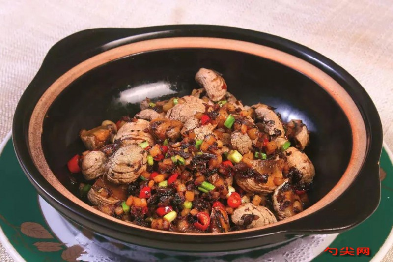 注意事項:此菜巧選口蘑搭配自制臊子,炒熟后焗熱,成菜脆滑適口,既有菌香,又有肉香。口蘑不要炸得太過,否則口感會變得綿老,但也不能炸得太輕,否則含水量過大,味道不香。炒制口蘑時要保持中火,以免糊鍋或炒制不均。焗制時利用砂煲的余溫即可,無需再加熱。根據個人口味調整調味品的用量,喜歡更辣的可以增加小米椒的用量,喜歡更鮮的可以增加生抽和辣鮮露的用量。